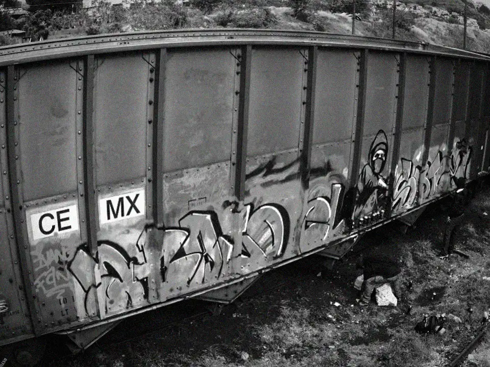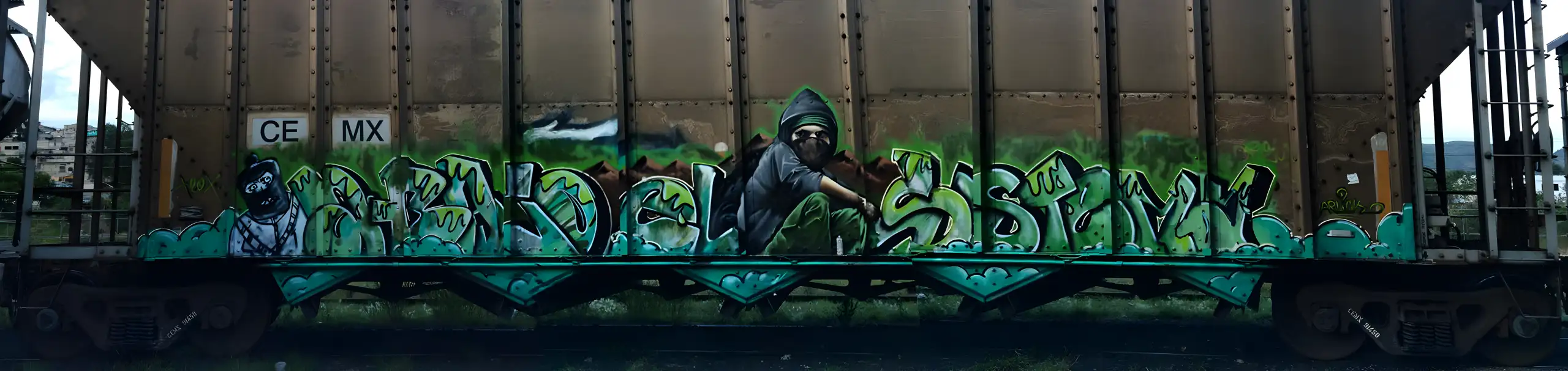 Esta pieza fue ejecutada en colaboración con Arlik, sobre el costado de un vagón en movimiento detenido por instantes, suficiente para dejar una huella. Al centro, un personaje en capucha —rostro cubierto, mirada directa— emerge entre letras que reptan como veneno verde: “ABAJO EL SISTEMA”, cargadas de energía cruda y línea sólida.