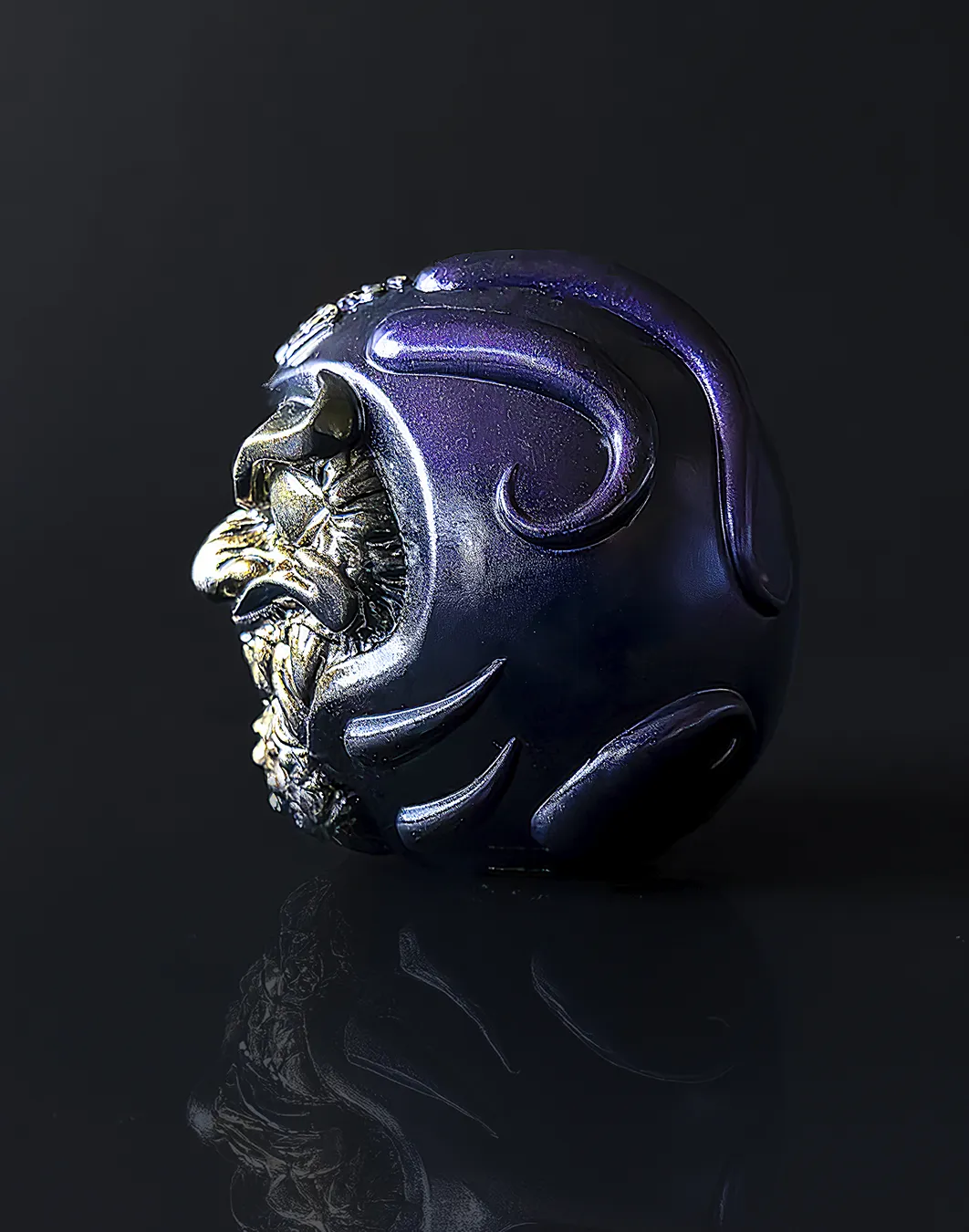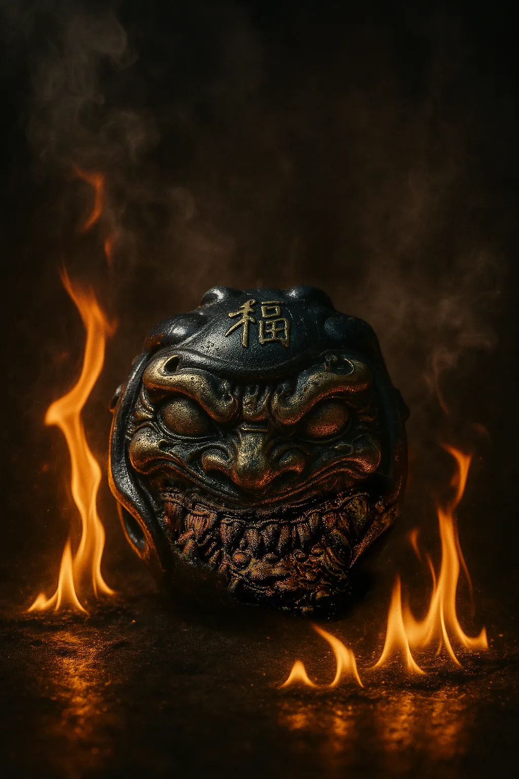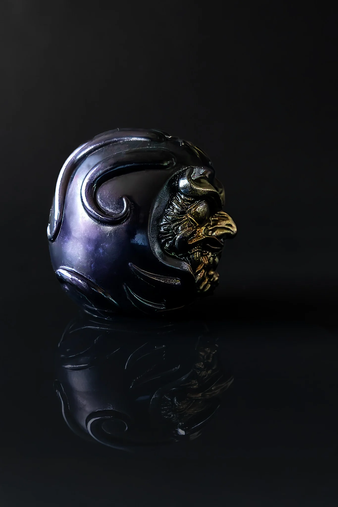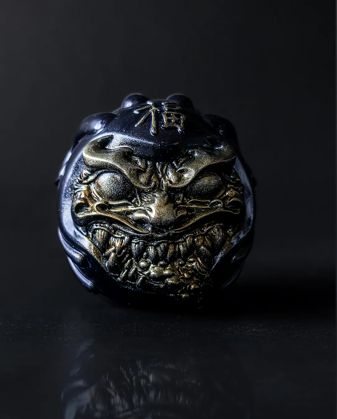 Su rostro distorsionado, de expresión salvaje y sonrisa desgarradora, simboliza no la buena fortuna, sino el lado oscuro de los deseos. La pieza refleja un espíritu que no concede deseos: los devora. Cada pliegue y textura fue modelado con precisión para provocar inquietud, seduciendo con su acabado metálico e iridiscente que cambia bajo la luz.