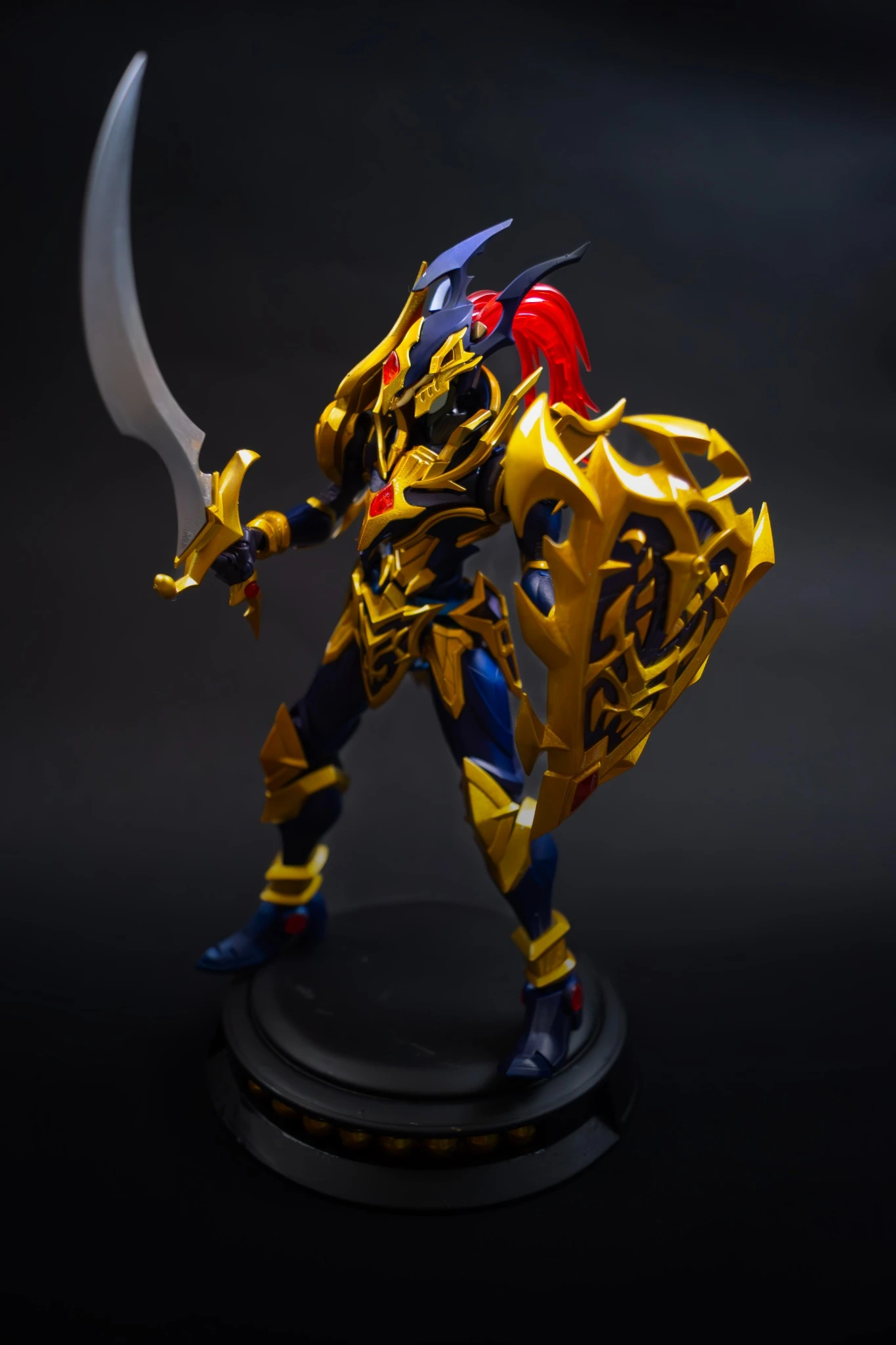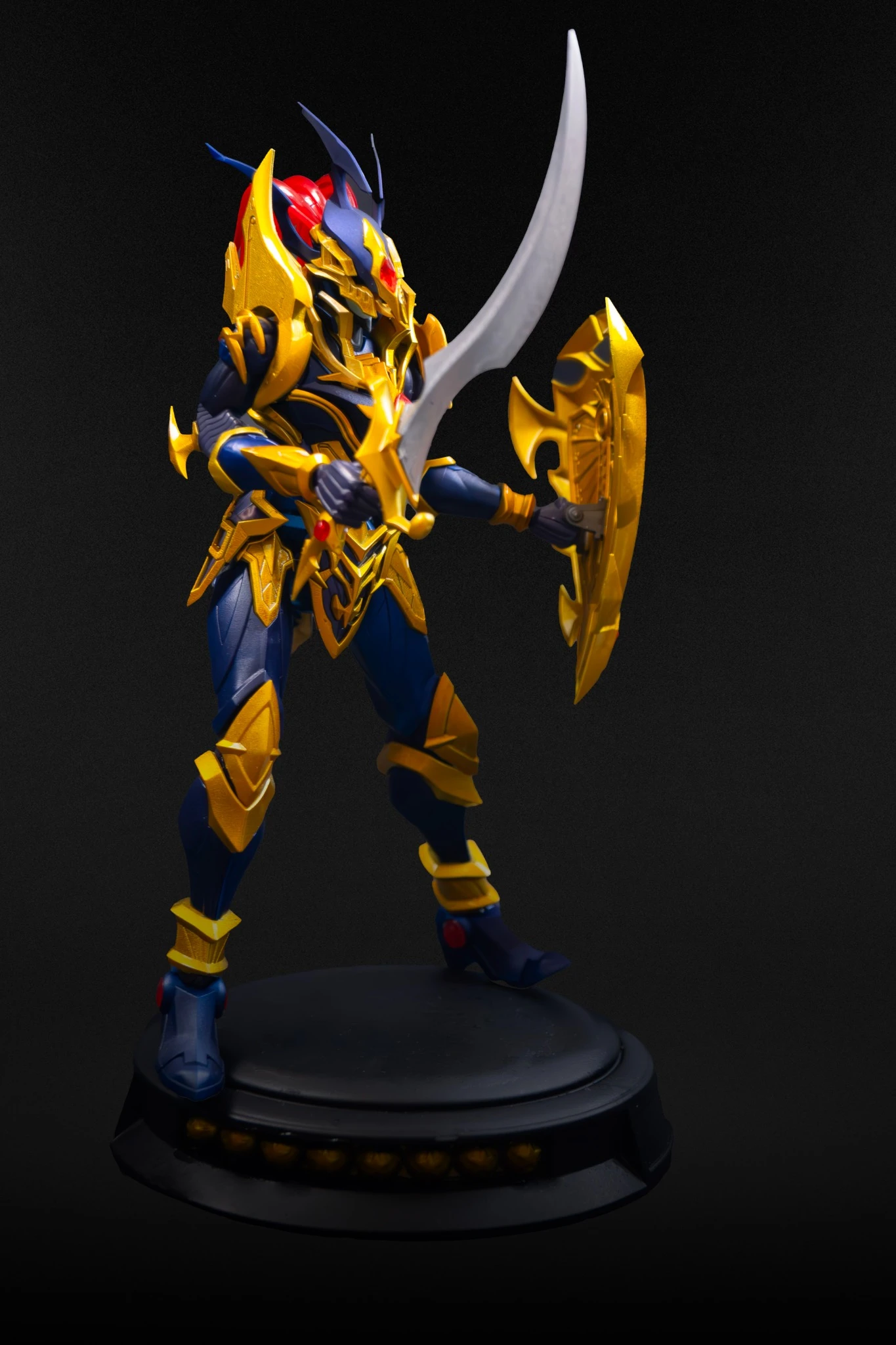 Como complemento, se añadió una base negra con detalles dorados, construida para elevar la figura tanto física como simbólicamente. No es solo un soporte: es una extensión narrativa del personaje.