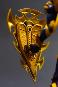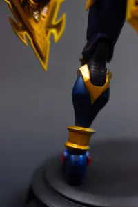 Como complemento, se añadió una base negra con detalles dorados, construida para elevar la figura tanto física como simbólicamente. No es solo un soporte: es una extensión narrativa del personaje.