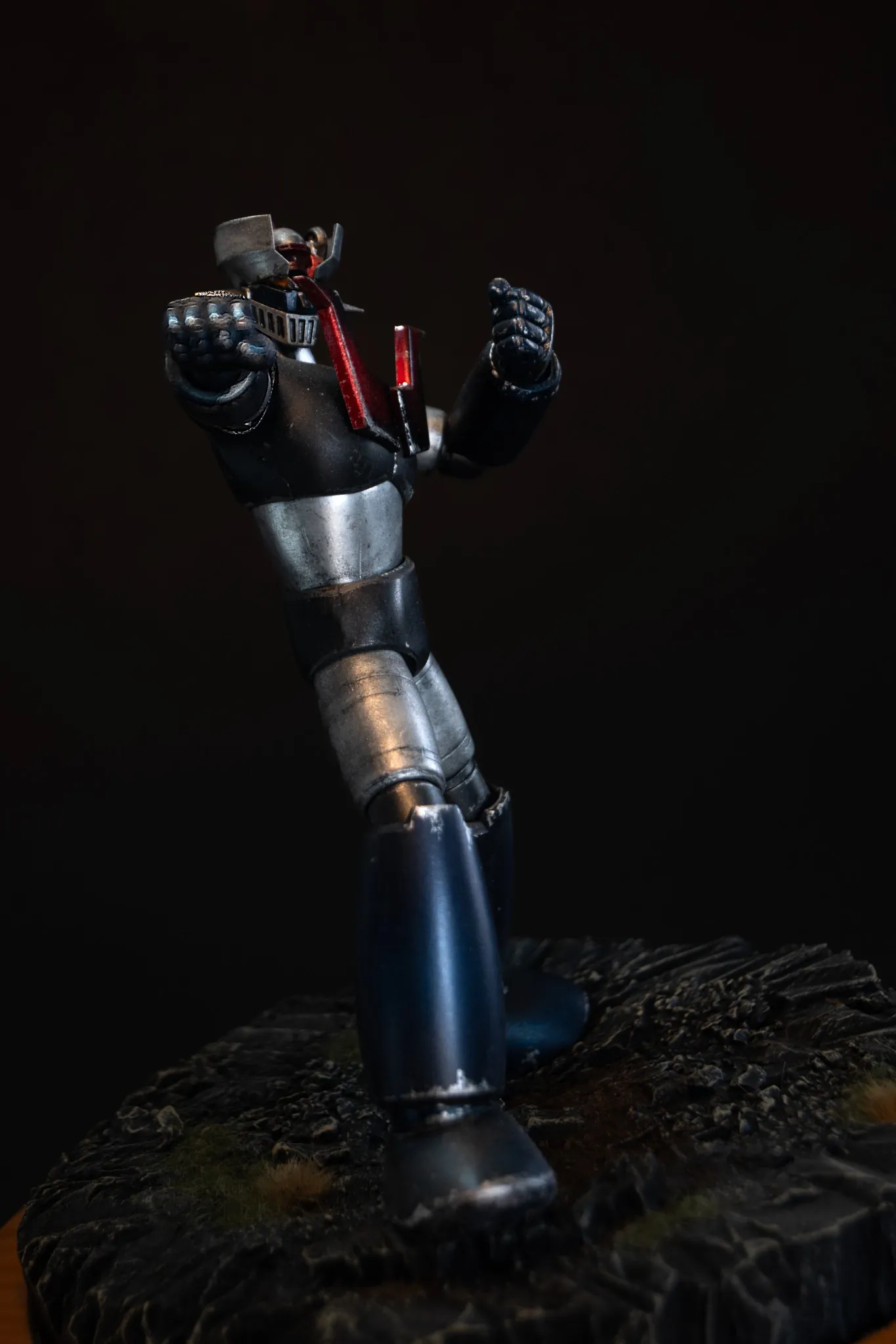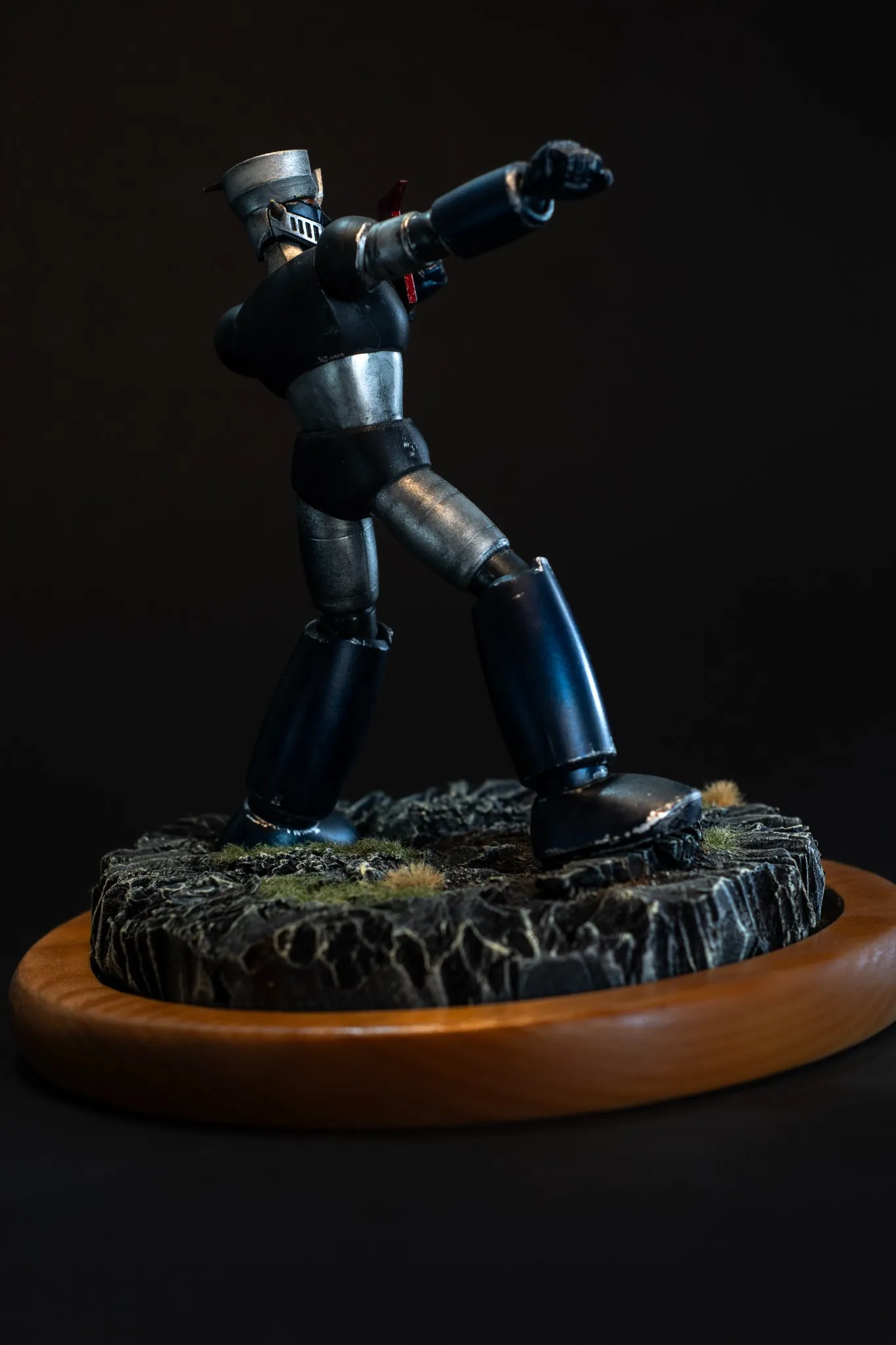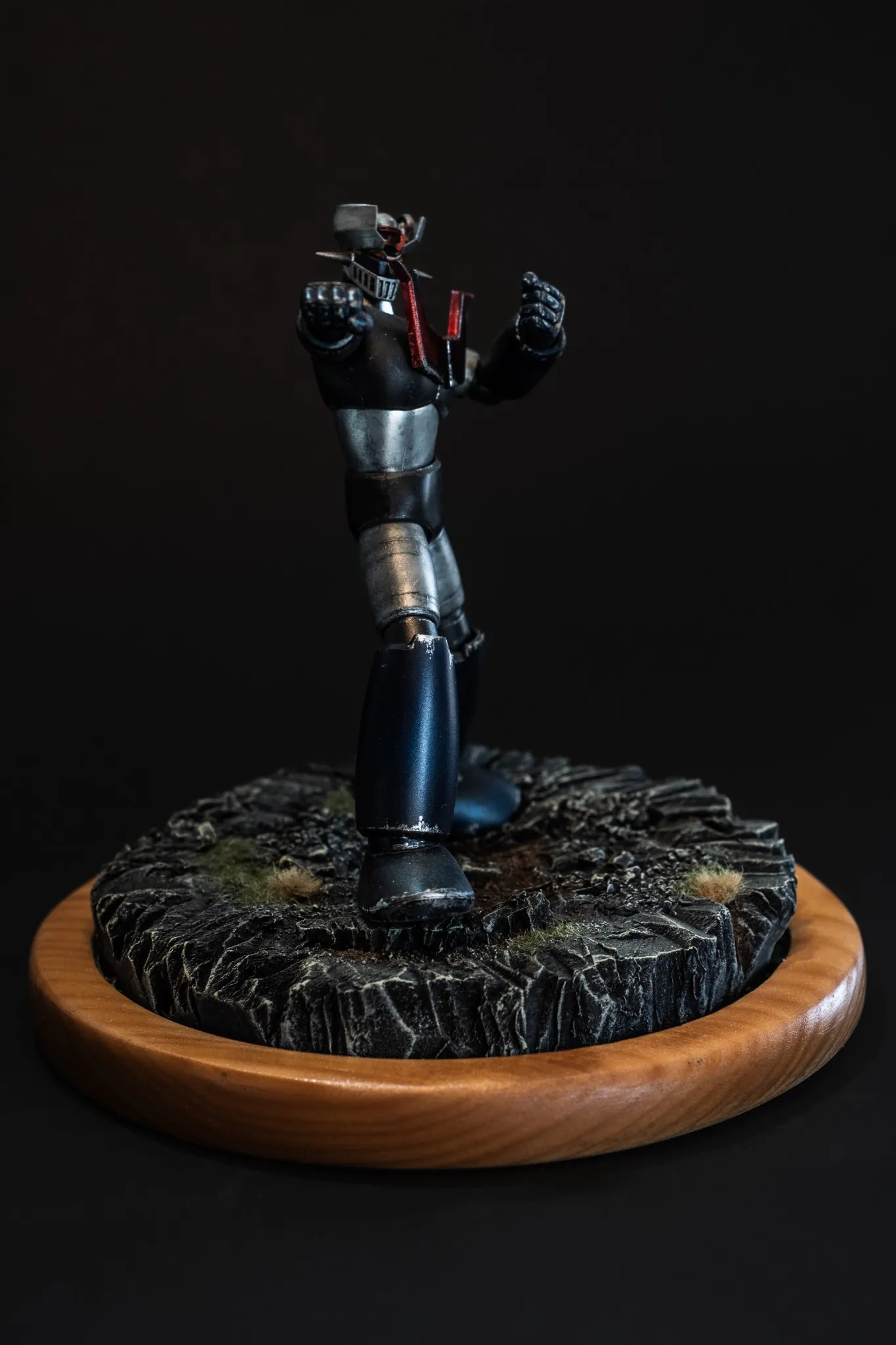 La base no es un accesorio comprado. Es un escenario construido a mano, fragmento por fragmento, como si fuera el terreno de su última batalla. Rocas rotas, vegetación mínima, tierra quemada. Todo colocado para que el peso de la figura se sienta real. Porque este Mazinger no está en pose heroica: está en resistencia.