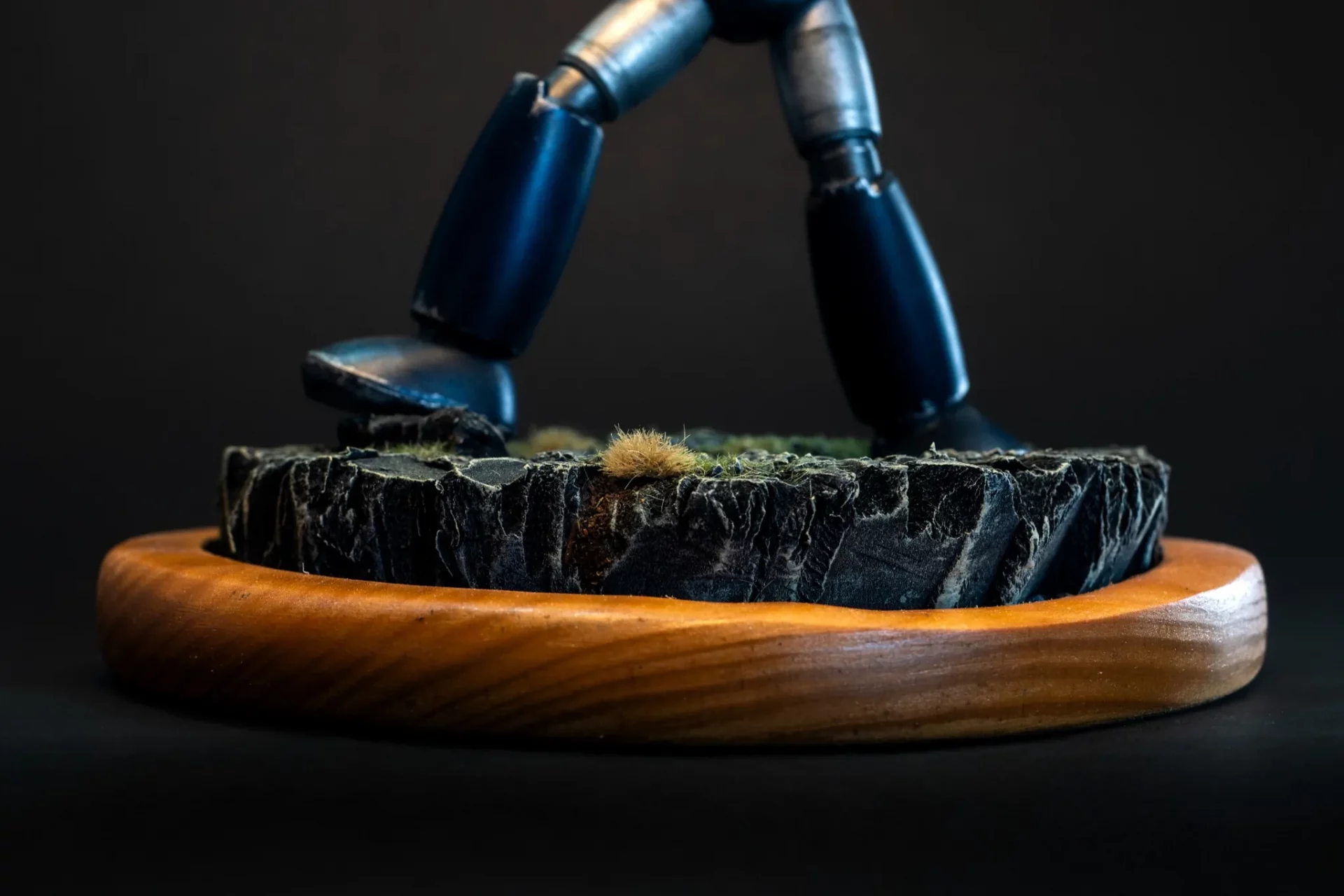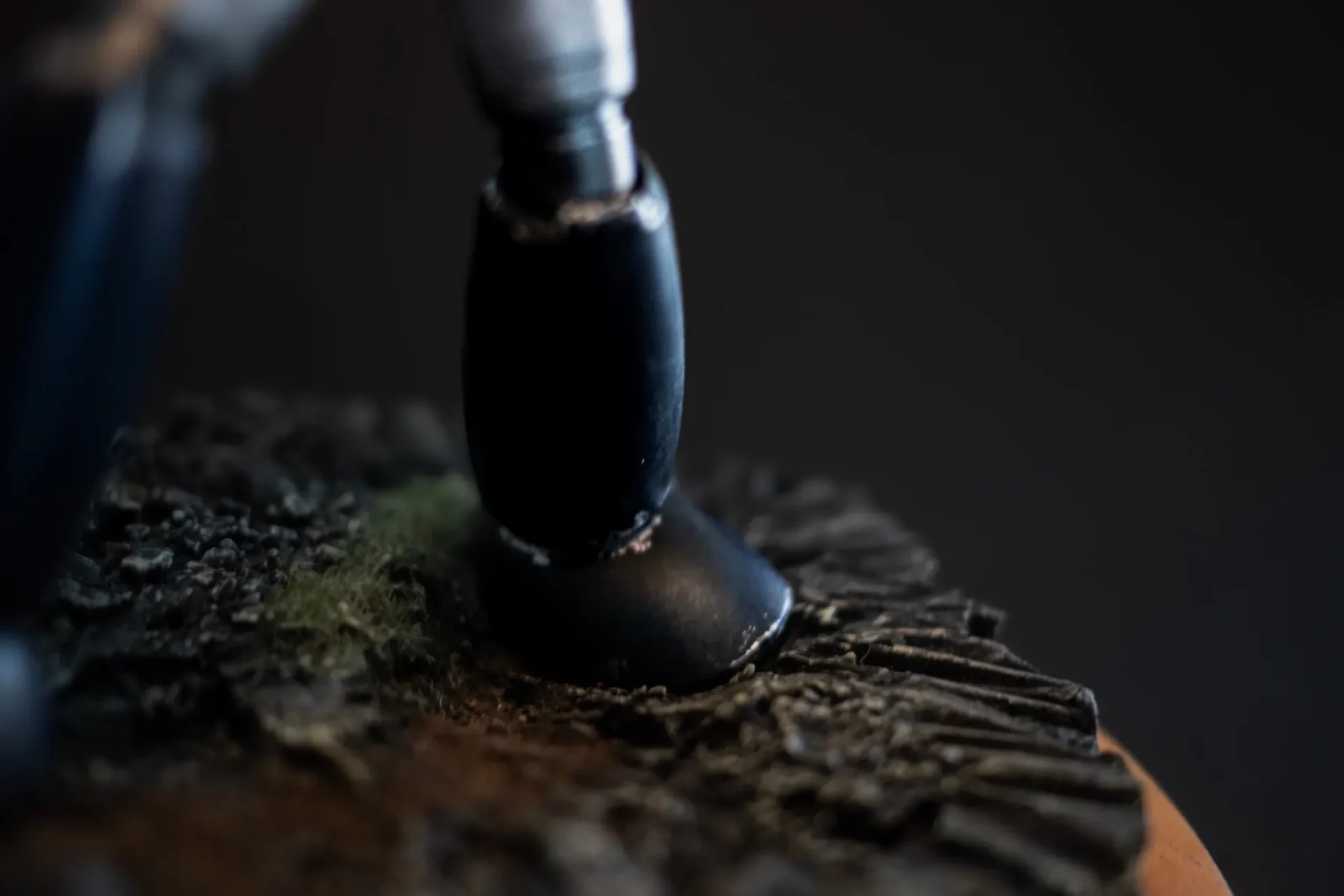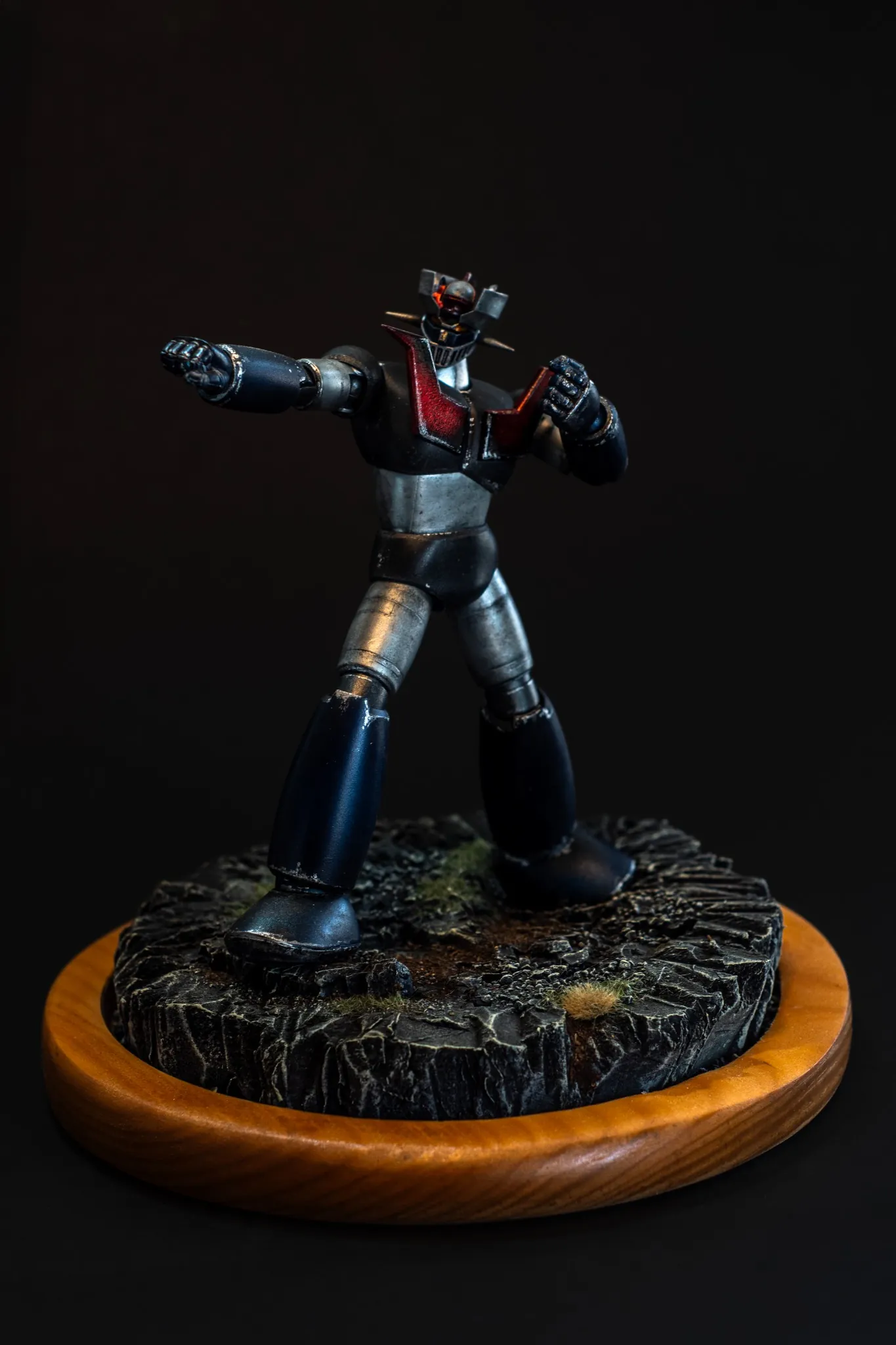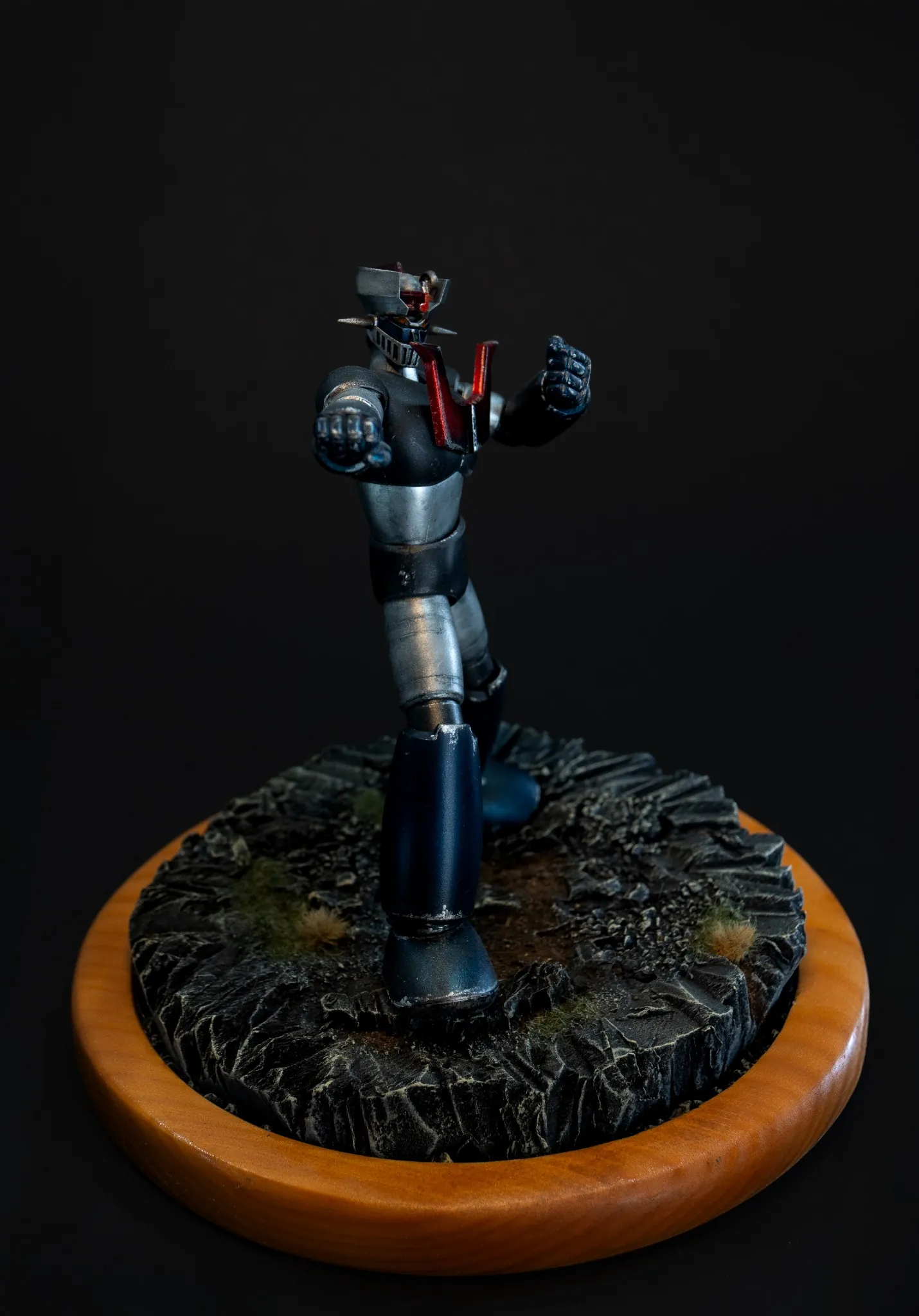 La base no es un accesorio comprado. Es un escenario construido a mano, fragmento por fragmento, como si fuera el terreno de su última batalla. Rocas rotas, vegetación mínima, tierra quemada. Todo colocado para que el peso de la figura se sienta real. Porque este Mazinger no está en pose heroica: está en resistencia.