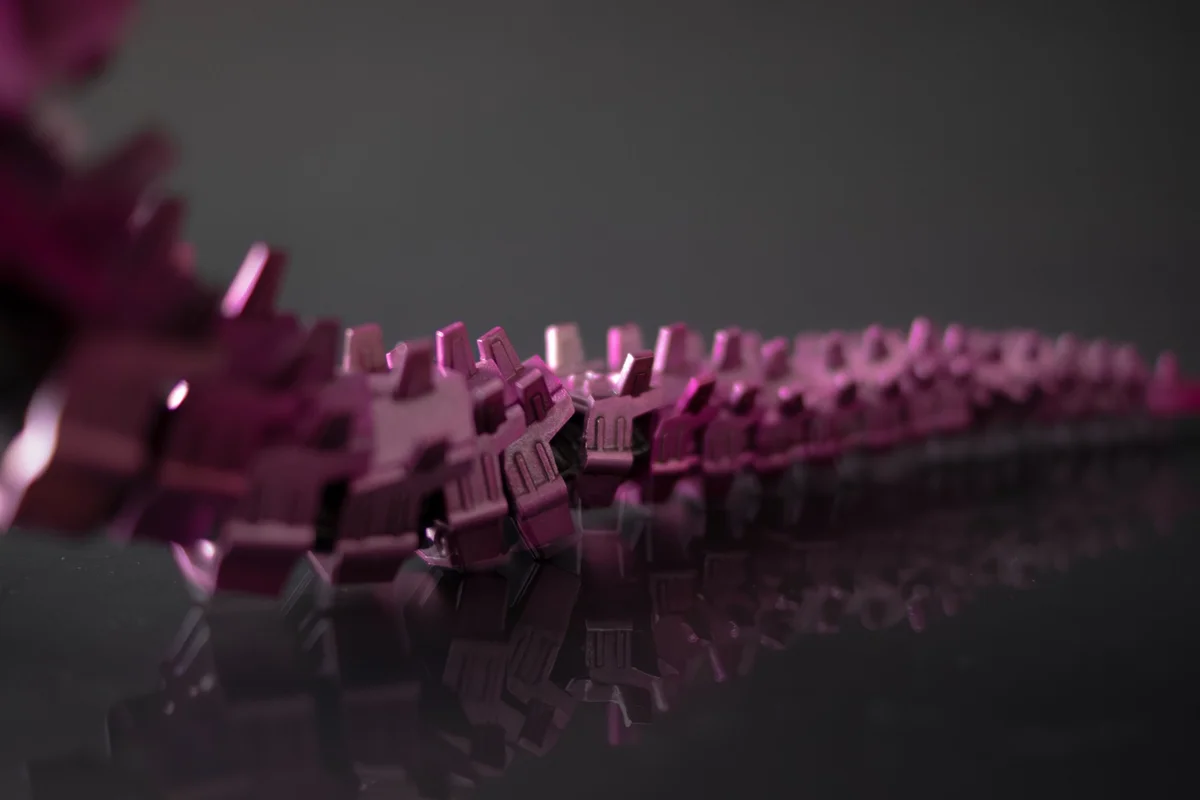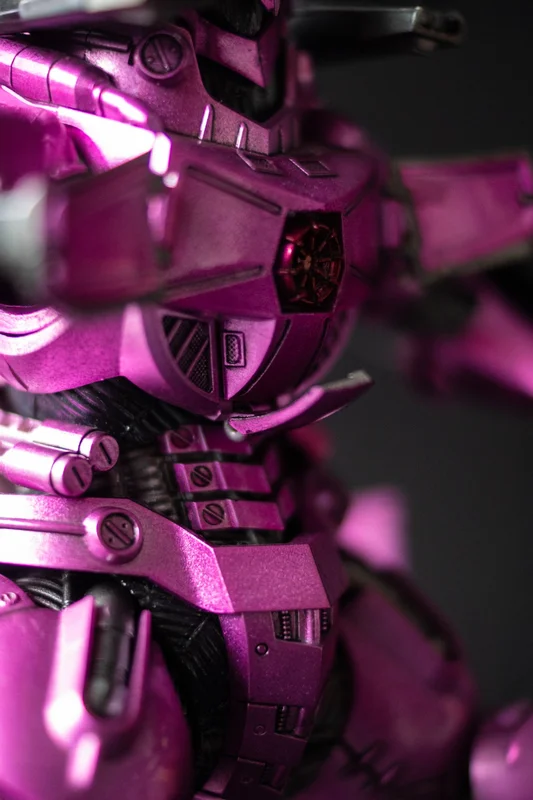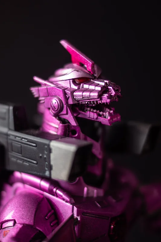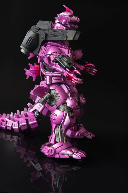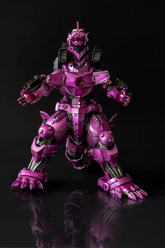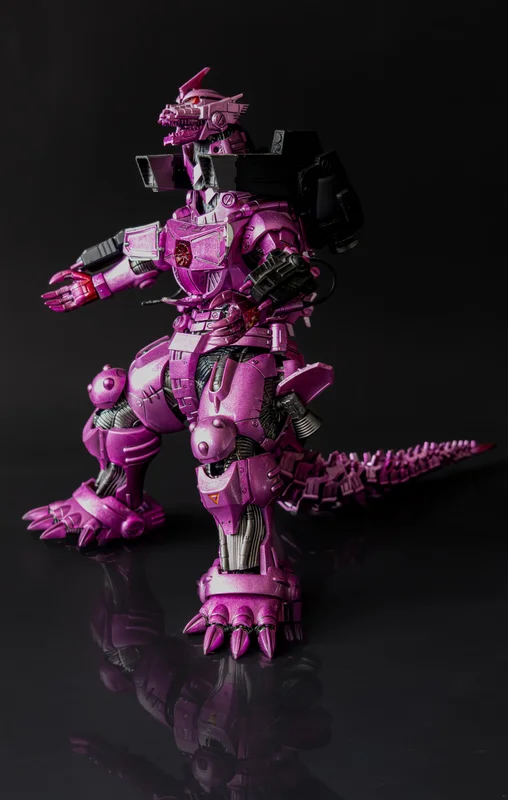 El MK-Z01 no es solo un Mechagodzilla: es una reinterpretación estética y táctica. Este modelo de Aoshima fue intervenido con un tratamiento visual completamente nuevo. Se reemplazó el esquema de color original por una gama metálica magenta con detalles en negro, plata y rojo translúcido que le otorgan un carácter más disruptivo y feroz.