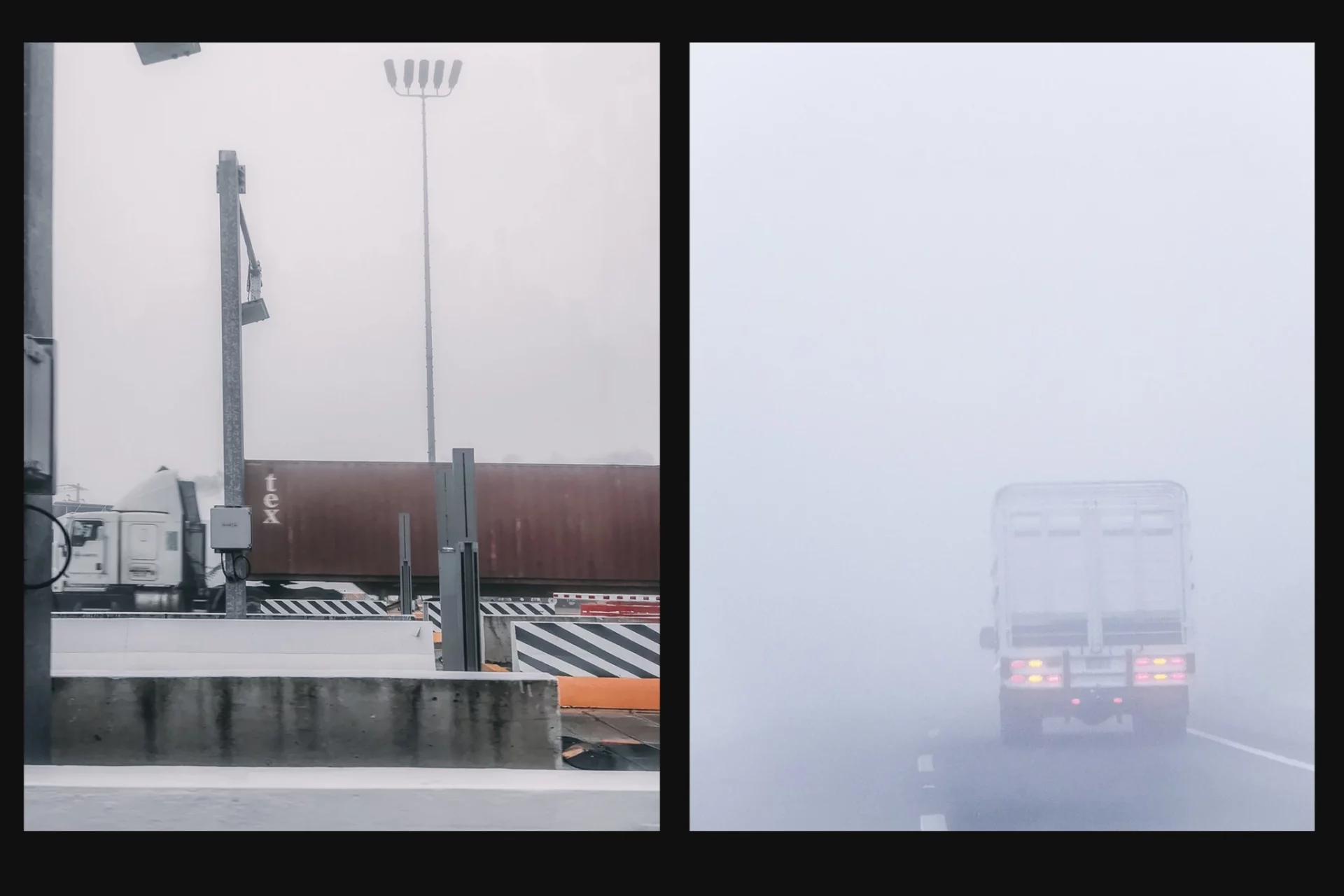 Mientras la niebla envuelve cada contorno, las formas se vuelven fantasmas industriales. Cada fotografía captura ese instante en que el paisaje urbano se convierte en algo más: un territorio hostil, donde lo humano queda en pausa y lo mecánico toma el control.