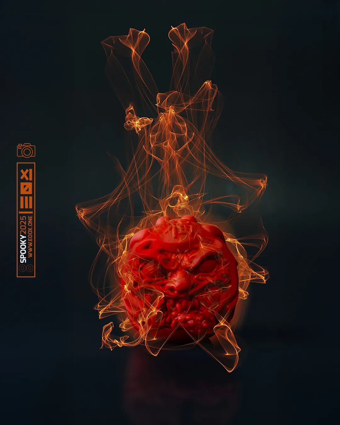 El fondo minimalista y los efectos de iluminación intensifican la presencia del objeto. El fuego digital y el reflejo nebuloso convierten al Daruma en una criatura ritual, lista para devorar cualquier deseo superficial.